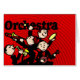 Röd bakgrund med tunn svart skisserar av koncentriskt cirklar bak en grupp av att leka och ord "orkester" för musiker över.