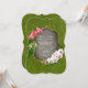 Denna bröllopsinbjudan har en romantisk, naturinspirerad estetik med en kraftig grön ram som påminner om en mosstäckt trädgårdsmiljö. Övre vänstra hörnet av ramen är prydd med eleganta rosa orkidéer, medan nedre högra hörnet visar livfulla vita orkidéer. Dessa blomsterarrangemang inramar den centrala delen av inbjudan, som har en mjuk, texturerad grå bakgrund.