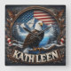 Ett örn står i stort sett på ett gren, med ett ramverk av berg med snö och en amerikansk flagga i avstånd, och visar sin normala närvaro.