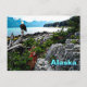 En digital målning av en örn perched på en driftwood loggar tvättat upp på denbeströdde kusten av Alaska; berg hägrar i avståndet. Text läs- "Alaska" kommer ut också.