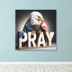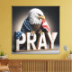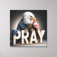 En stor örn är nedbruten i en amerikansk flagga, som är upphöjt över brev med texten "PRAY".