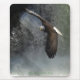 Ett stort amerikanskt Örn har vattenfallssprejen när han sår förbi på vägen till den närliggande skogen.