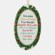 Säg "God jul" på arton olika språk på denna ovala, keramiska Julgran-dekoration. Olika typsnitt stilar och färg användes för att inkludera hälsning på engelska, tyska, hawaiiska, italienska, koreanska, spanska, Fransk, portugisiska, indonesiska, ukrainska, vietnamesiska och andra. Varje sida har olika formuleringar med hull och bär på bakgrunden.