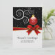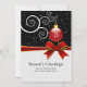 Ett vanligt platskort för årsägarnas hälsningar i form av ett ornament Monogram Namn är en mall som du kan använda för att anpassa med din egen Julhälsningar hos din familj namn eller dina affärsanställda. Röd ornament på ett vitt vitt gren och fallande snö i bakgrunden med en bild av ett rött band. Dessa platta kort i hälsning är också perfekt för helgdagskort inom företag och småföretag.