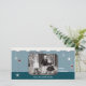 Ett akvat och teal, modernt, anpassade, jullkort med snöflingor, prydnadsföremål och snö inslag.