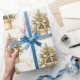 Lägg i Julklapp i år med vår vackra Rik Guld Ornaments & Bows. Den har en vackert handmålad vattenfärgsdesign, med ett krympande Julgran med ett stort båge och prydnadsföremål i rik guld. "God jul" är skrivet på ett snyggt, dekorativt kalligrafi, som tillför en viss grad av förfining och värme. Perfekt för att ha stängt in presenter för familj, vänner eller nära anhöriga, kommer detta högkvalitativa papper att göra varje gåva speciell under träd.