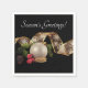 Denna festliga design har en vit ornament med en kvist städsegrön och ett vitt och guldvridet band, på en svart bakgrund. Som accent finns en tallkotts, röda bär och guldpärlor. Den svarta bakgrunden kan anpassas till en färg som du väljer. Texten "Seasons Greetings" kan anpassas.