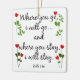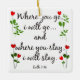 Personlig med skriptverse på Giftermål (Ruth 1:16) "Vart du ska, ska jag gå...Och där du stannar, stannar jag." Svart text, med Röda hjärtblommor. Kusomisera prydnaden med par namn och årsdagen på baksidan av prydnadsämnet.