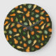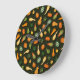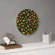 Den här väggklockan har små handdukar i skuggor av grönt, gult och orange på mörk grönt bakgrund.