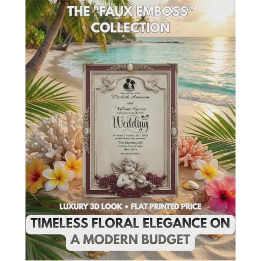 Announce your formal union with this classical baroque design. A romantic choice for fairytale church nuptials featuring deep red blooms and sculpted art.This design features a printed faux 3D bas-relief effect resembling sculpted stone architectural molding. A cream and ivory marble background sets the stage for deep burgundy and white roses entwined with a laurel wreath. A cherub angel plays the violin near a bride and groom silhouette, all framed by elegant blackletter and calligraphy scripts.This is a flat printed image with a stone effect, not actual raised material.