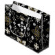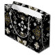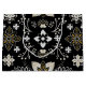 Ornate black and white floral pattern with gold accents. Central symmetrical flower surrounded by leaf motifs and intricate branches. Elegant, decorative design.