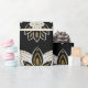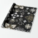 Ornate black and white floral pattern with gold accents. Central symmetrical flower surrounded by leaf motifs and intricate branches. Elegant, decorative design.