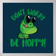 En glad tecknad groda med stort uttrycksfullt ögon åtföljs av lekfull text Var inte glad i ljus grönt. Grodans rosa tunga håller ut lite. Bakgrunden är en blåblå skapar grodan och texten ser ut på ett dynamiskt sätt. Underbar gåva till groda älskare. Märkre: groda, amfibier, tecknad, humor, lycklig, roligt, bullgrog, citat, cheerful, gullig, quirky, wacky, grönt, karaktär, lekfull, glad, leende, text, vänlig, blå, tunga, djur, fånig, inspiration, motivation, vibrant, adful, konstig, typografi