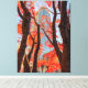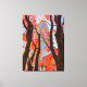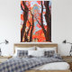 Bilden fångar upp en livfull höstscen med en lång skyscraper som går genom en kanopi med grövre röda löv. Grenar i träd, med sin brunbruna bark ram, det moderna byggnaden, skapar en slående kontrast mellan natur och stadsplanering. Löven är en blandning av djup misshandel och orange, som tillför en varm känsla till sammansättningen.