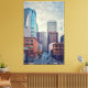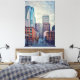 Bilden fångar en gatuvy i San Francisco och visar en mängd byggnad och skyscraper. Arkitekturen sträcker sig från äldre, kortare strukturer i bruna och röda nyanser till modernt byggnad med glasfasader som reflekterar himmel. Gatan är blöt från det senaste regnet och har korsningar och parkerade bilar.