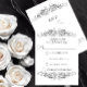 © 2023 Socialite Designer Inc. Elegant event Responcard har en vacker svart blomning på vit bakgrund. Para den här elegantens OSA kort med matchande bröllopsinbjudan och andra produkter från den här designsamlingen.