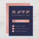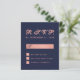 En OSA för en bröllop-budget för flottan och ro guld. Bakgrunden är marin blå. Osan är faux ro guld, resten av texten har rosa färg som liknar ro guld, förutom bokstaven M, som är marinblå. Rubriken OSA och brev M skrivs i ett kalligrafiskt skript för elegant, resten i versaler. Den rektangulära rutan för namn, de små fyrkantiga rutorna och baksidan är (faux) ro guld.
