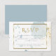 Svarskort för bröllop OSA | Modern och rustik, ljusblått och guld-färgstänk. Guld ram, som är tillräckligt genomskinligt för att se vattenfärgen bakom sig, får den osa informationen skriven i ett contemporary-teckensnitt. Matval. Design skapat för BarefootBride™ av © WhimsicalArtwork™ Anpassa text, font stil, färg och storlek. Vi skapat att den här mallen är till för att göra det enkelt för dig att anpassa dig till din egen information. Detta är en del av en komplett Bröllop Stationery Suite med matchande bröllop, babydusch och andra händelsematerial.