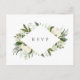 Vår samling av vattenfärgen blommigt bröllop i Elfenbenskusten har delikataktigt målat vattenfärgsgrej, grönt botaniskt löv och vita och elfenbensblommor. Anpassa det här matchande vykortet för OSA med önskat svarsdatum och målval eller inmatningsval.