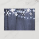 Vinterbröllopsbudget, OSA MINI STORLEKT kort med menyalternativ med vit snöflingor och tvinklad hängande ljus på en mörk, marin blå lada-bakgrund. Idealisk för er vintertid, elegant vid land under bröllop.