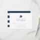 Designat att samordna med våra inbjudningssamlingar för Nautical Mix-bröllopet, har detta svarskort för bröllop vid kusten i marinen och vitt en lång segelbild överst med elegantens blå frakt och ett marint och vitt vågrät som är uppåt.