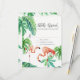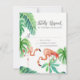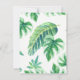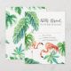 Matchande svarskort för OSA. Loose. Modern. Contemporary vattenfärgen stil med handmålade flamingfåglar i rosa och en mängd tropiska löv inklusive löv av bananer. Föränderlig bakgrund färg. Konstupphovsrätt, Audrey Jeanne Roberts, alla höger reserverade.