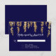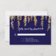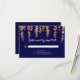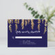 Djuphavets blå bakgrund vid midnatt med guld faux glitter kommer träd löv och tvilling ljus. Svarskort för osa med vitt kuvert. Modern, enkel, minimalistisk men ändå fantastisk bröllopsinbjudan. Art copyright, Audrey Jeanne Roberts