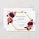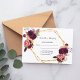En elegant-OSA kort med mallar för svar efter datum, namn osv. Vattenfärgade fjädrar och ro, blommor i burgundi. En faux guld och vit ram. En vit bakgrund framför, svart text.