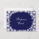 Fintvätt snöflingor i ett lacy mönster i en djup blå bakgrund, accentuera denna samordnande OSA för inbjudan till bröllopet i marinen Snöre.