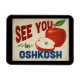 En charmig kylmagnet från Oshkosh Wisconsin vintage resor med ett fint rött äpple, tillsammans med texten från roligt retro stil där det står: "Se dig i Oshkosh"