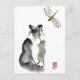 Kitten leker på varvet vid vatten-funktionen när en dragonfly i zoomarna är en obehaglig insekt. Sumi-e, Zen bläck-målning av Ellen Miffitt alias Nine Lives Studio