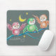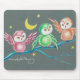 Tre lyckliga vänner--ljusa färgglada ugglor--sitt på en gren, under natthimmlen, med månen och stjärnor. En uggla är rosa, är en grönt, och en är orange. Roligt gladlynt konst, som skulle, gör en underbar gåvaför barn, ungar på hjärta, ugglaälskare och ugglasamlarear.