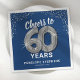 Elegant 60 födelsedagsfest blöjor med en snyggt blå bakgrund som kan bytas ut mot vilken färg som helst, silver glatt glitter, ordspråket "fuskar till 60 år" med sextio silver hellium-ballonger, deras namn och firande.