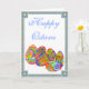 Detta cheery kort presenterar colorfully dekorerade ägg med varje brev av Ostara på olik.