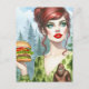 En kvinna i en Sasquatch-utskriftskjorta håller en ostburgare i skogen AI-genererad konst