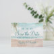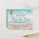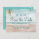 Ömålning av strandscen med havsvågor, sandstrand och palmer, med en vacker turkos blå himmel. Med modern typsnittsmanus. En sommar tropisk strand, eller destination bröllopsdesign - Personliga bröllopskort "Save the Date"!
