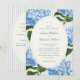 En formell och elegant bröllopsinbjudan inspirerad av bröllop på östkusten. Den har preppy, franska blå ränder som bakgrund, vintage akvarell hortensior och elegant, tidlös typografi.
