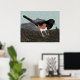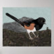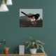 Poster utskrift med min ursprungliga blandade mediefärg av en Östra Towhe som kliar på marken bland fallande fir nål och twig. Vattenfärgsfågeln är oftast svart med vit bröst och rost färgad. Bakom den ligger en stor sten mot en grassande bakgrund av grönten blek.