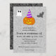 Den här är till alla som har födelsedag strax före eller på Halloween-dagen, och kan användas för personer i alla åldrar trots några av de söta elementen. Huvudfokus för den här är jack-o-lanternen som bär på en festhatt. Kortet har anpassningsbara element som kan ändras med hjälp av den blå "Anpassa denna design"-knappen. Du kan ändra personens namn och ålder, datum och tid för festen, festens plats och RSVP-information.