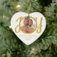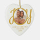 This keepsake heart-shaped First Christmas Engaged photo ceramic ornament is decorated with the word JOY in stylish gold script typography. Easily customizable.