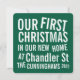 First Christmas in <add name of your street> Street in modern and simple bold serif typography on simple background.