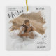 Our First Christmas Married Photo Brush Stroke Ceramic Ornament. Celebrate your very first Christmas as a married couple with this beautiful and memorable photo ornament. Featuring your wedding photo framed by elegant brush strokes and the heartfelt message 'Our First Christmas Married', this elegant ornament is a perfect keepsake. The design also includes space for your wedding date and names, making it a truly unique piece to cherish for years to come. Hang it on your tree to relive those special wedding day memories every holiday season.