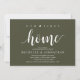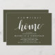 Our first home, new home housewarming party invitation card ("our first home") in olive green theme, with cute little heart. Planning a housewarming party in celebrating your new home with your family and friends? Invite your guests with this beautiful and perfect Rustic calligraphy themed housewarming party invitation card.