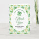 A charming St. Patrick’s Day baby shower thank you card featuring a soft green background, golden horseshoes, and scattered four‑leaf clovers for a sweet “lucky charm” theme. The central white oval frames the event details beautifully, creating a warm, welcoming design perfect for celebrating a growing family. Ideal for March celebrations, Irish‑inspired themes, or any baby shower that embraces luck, joy, and new beginnings.