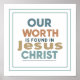 The Our Worth Is Found In Jesus Christ message is displayed in a few tones of blue and ochre brownish gold palette. "I have been crucified with Christ and I no longer live, but Christ lives in me" (Galatians 2:20) is the spiritual foundation, as well as for other persons, events or utility. This design highlights the practical impact of identity in faith and the usage of spiritual grounding.