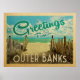 I den här Hälsning-vykortsdesignen från vintagen utanför Banker finns en sandstrand med en vacker turkoshavet över vatten och över havet, ett blå himmel med gigantiska vita moln. I vintage resor stil.