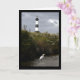 En Egret står i en brook medan en fyr står i bakgrunden.