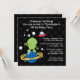 Denna födelsedagsfestinbjudan för pojkar 5.25x5.25 har ett gulligt outerspacetema. Det finns ett grönt främmande anseende på vinka för planet. Hans spaceship och några stjärnor är i bakgrunden. Du kan lätt skräddarsy din information om partyet upptill och höger. Ta copyrightt på ©Zenware designer