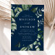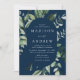 Inbjudningar i elegant bröllop som innehåller uppgifter om bröllop som förvaras i en ovala ram som omges av eukalyptus, ferns och annan rik greenery med marin bakgrund. De moderna botaniska bröllopsinbjudningarna går tillbaka till en fast marin blå bakgrund. Designad att samordna med vår samling i Abundant Greenery bröllop.