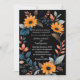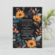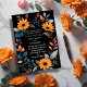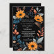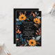 Den här kortdesignen i bröllop har en elegant, ovala blommigt ram som är centrerad på en djup svart bakgrund. Ram består av pulserande solrosor av orange, kompletterade med en uppsättning blå, grått- och persikofärgade löv och spriter av färgad, som skapar en harmonisk blandning av varma och coola toner. Blommornas och bladens arrangemang bildar ett naturligt gräns runt kortet, skapar den perfekt för att visa detaljerna kring bröllop i mitten. Utformningen kombinerar modern sofistikering med en aning rustik charm, och skapar det som ett idealiskt val för ett bröllop som omfattar både elegans och naturens skönhet. Anpassa kortet med namn och information om bröllop. Du kan ladda ned kortet till din mobila enhet eller dator. Kortet skapades med hjälp av ai.